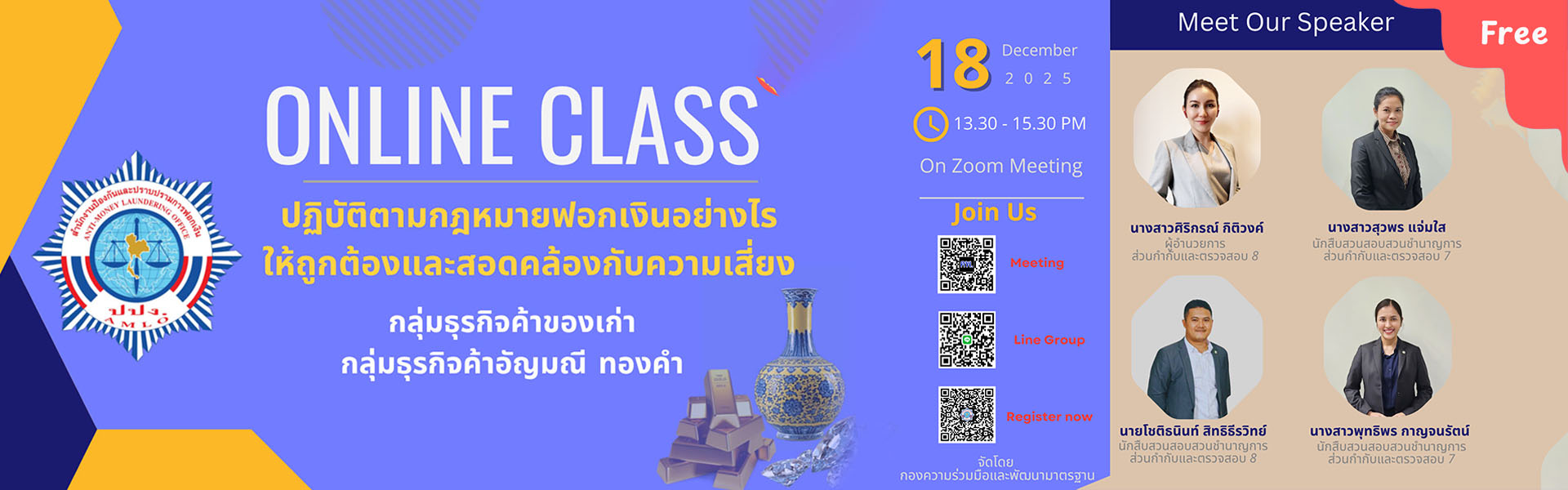 วันที่ 15 ธันวาคม 2566 เวลา 14.00 น. กองความร่วมมือและพัฒนามาตรฐานสำนักงาน ปปง. จัดโครงการส่งเสริมความรู้ความเข้าใจในการปฏิบัติตามกฎหมายให้แก่ผู้มีหน้าที่รายงาน (Outreach) แบบมุ่งเป้าไปยังกลุ่มที่มีความเสี่ยง สำหรับกลุ่มธุรกิจค้าอัญมณีทองคำ รูปแบบการอภิปรายออนไลน์ ผ่าน Microsoft Teams โดยมีข้าราชการจากส่วนกำกับและตรวจสอบ 7 กองกำกับและตรวจสอบ ประกอบด้วย พันตำรวจโท ชัยชนะกาญจนะคช ผู้อำนวยการส่วนกำกับและตรวจสอบ 7 นางสาวนภภัสสร สอนคม นักสืบสวนสอบสวนชำนาญการ นางสาวอุมาพร แก้วศักดาศิริ นักสืบสวนสอบสวนชำนาญการ นางสาวสุวพร แจ่มใส นักสืบสวนสอบสวนชำนาญการ และนางสาวพุทธิพร กาญจนรัตน์ นักสืบสวนสอบสวนชำนาญการ ร่วมเป็นวิทยากรอภิปราย ในหัวข้อ "ปฏิบัติตามกฎหมายฟอกเงินอย่างไรให้ถูกต้องและสอดคล้องกับความเสี่ยง" ซึ่งมีผู้มีหน้าที่รายงานกลุ่มธุรกิจค้าอัญมณี ทองคำ และข้าราชการสำนักงาน ปปง. เข้าร่วมโครงการ รวมจำนวน 120 คน